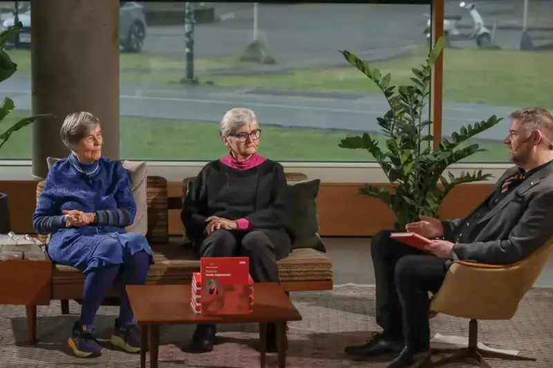Foto: To «kvinnelige pionerer», Sidsel Sandelien (t.v.) og Elisabeth Schjølberg i samtale med redaktøren av årboka, Knut Baar. Fotograf: Håkon Aurlien.