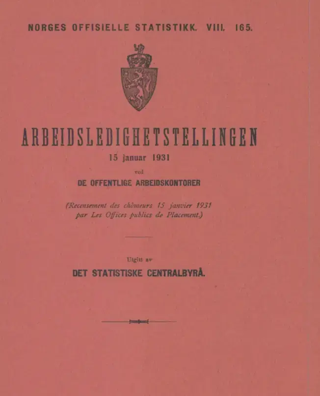 Post 4 - Tida og vegen1/1 Åpne eller lukk bildetekstNorges offisielle statestikk VIIL 165.Utdrag fra Arbeidsledighetstellingen, 15. januar 19311/9Forside2/9Side 273/9Side 544/9Side 585/9Side 706/9Side 717/9Side 718/9Side 729/9Side 73 Åpne eller lukk bildetekstLes hele her: Arbeidsledighetstellingen, 15. januar 1931 Nyttige linker Nødsarbeid - store norske leksikon (snl.no)