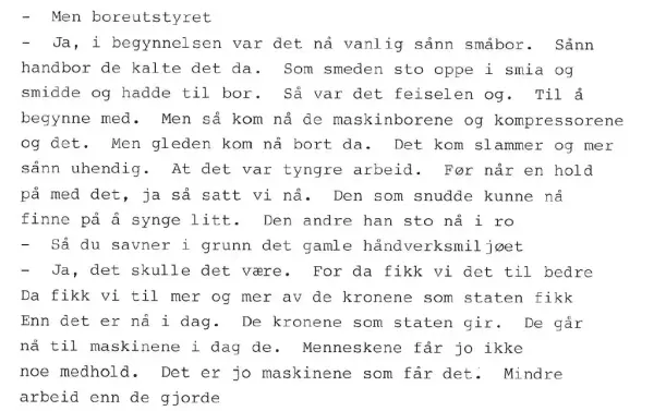 Post 3 - Norsk fjellsprengningsmuseum 1/1 Åpne eller lukk bildetekst Om fjellsprengeren Your browser does not support HTML5 video. 1/1 Om fjellsprengeren og ingeniøren, med seniorrådgiver ved Norsk vegmuseum, Geir Paulsrud. Video: Stian Tranung/Norsk vegmuseum Åpne eller lukk bildetekst Intervju Intervju med Vegarbeider Olav Bremseth (f.1918). Intervju gjennomført 1985. 1/2 Utdrag fra intervju med Vegarbeider Olav Bremseth (f.1918). Intervju gjennomført 1985. 2/2 Utdrag fra intervju med Vegarbeider Olav Bremseth (f.1918). Intervju gjennomført 1985. Side 10. Åpne eller lukk bildetekst