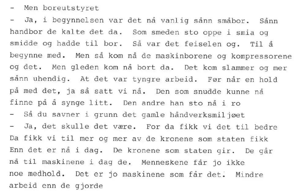 Post 3 - Norsk fjellsprengningsmuseum1/1 Åpne eller lukk bildetekstOm fjellsprengeren Your browser does not support HTML5 video.1/1Om fjellsprengeren og ingeniøren, med seniorrådgiver ved Norsk vegmuseum, Geir Paulsrud. Video: Stian Tranung/Norsk vegmuseum Åpne eller lukk bildetekstIntervjuIntervju med Vegarbeider Olav Bremseth (f.1918). Intervju gjennomført 1985.1/2Utdrag fra intervju med Vegarbeider Olav Bremseth (f.1918). Intervju gjennomført 1985.2/2Utdrag fra intervju med Vegarbeider Olav Bremseth (f.1918). Intervju gjennomført 1985. Side 10. Åpne eller lukk bildetekst