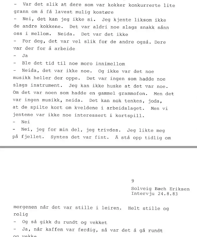 Utdrag av intervju med Solveig Bæch Eriksen. Intervju gjort 24.8.83. Side 8 - 9/9