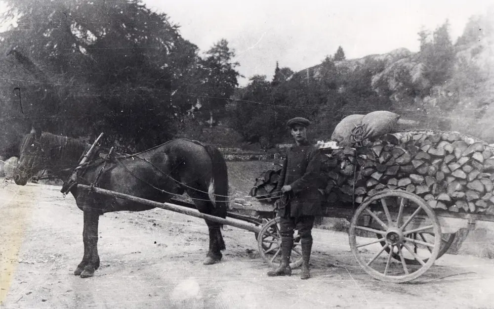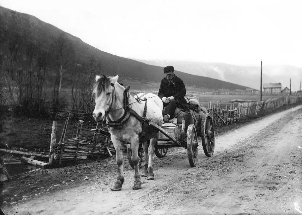 Jehans Haugen med fjording og firehjuls vogn. Kjøringen var i området Otta–Skjåk i Gudbrandsdalen. Fra ca. 1920 – 1930. Foto: Norsk vegmuseum. - 2/2