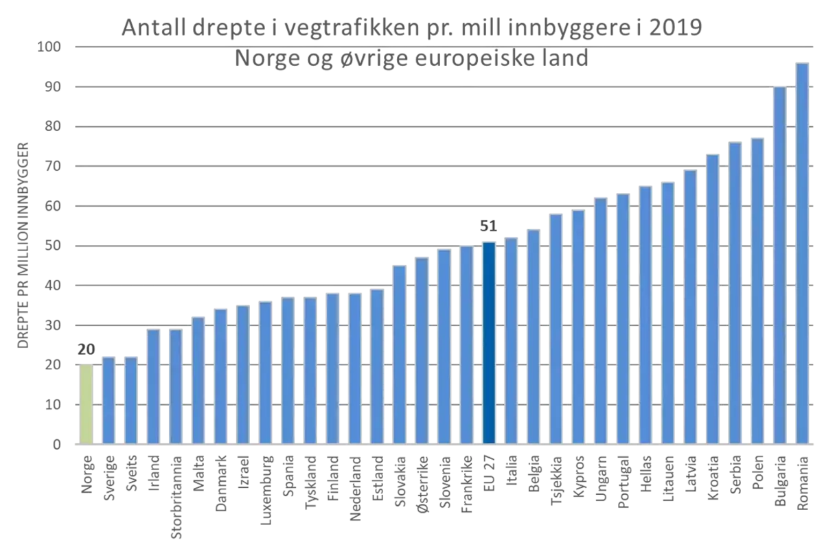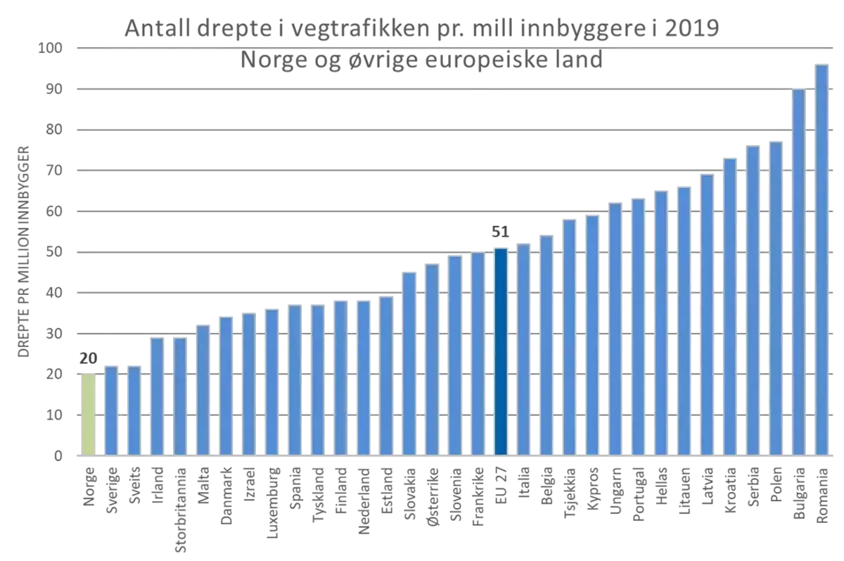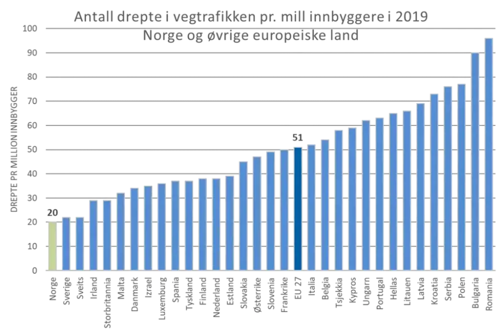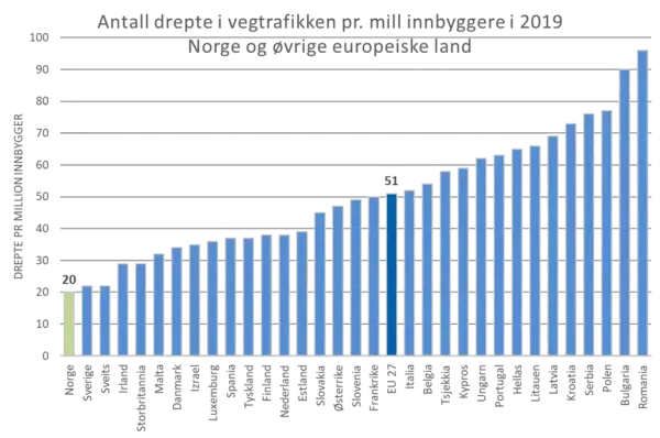 Graf over antall drepte i vegtrafikken pr. mill innbyggere i 2019