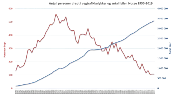 Graf over antall personer drept i vegtrafikkulykker og antall biler i Norge 1950-2019