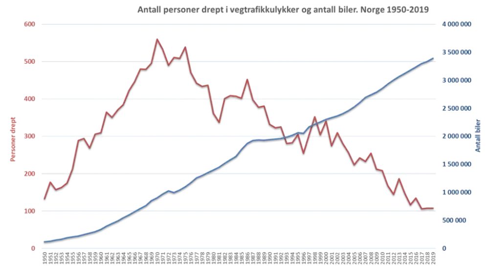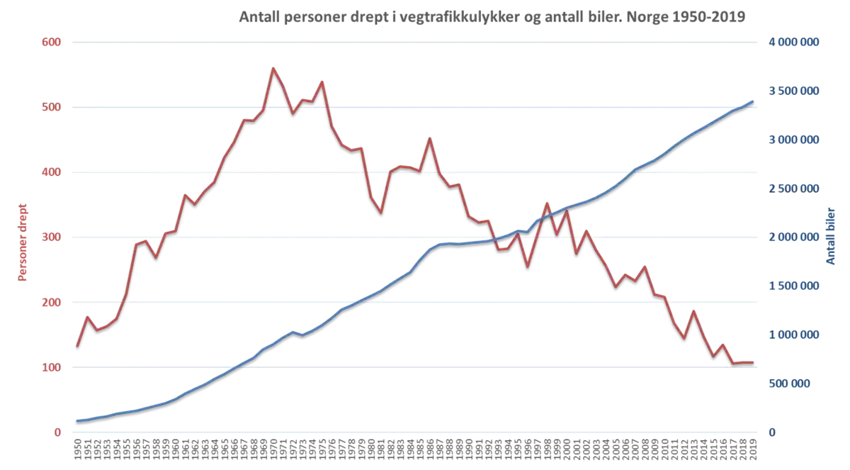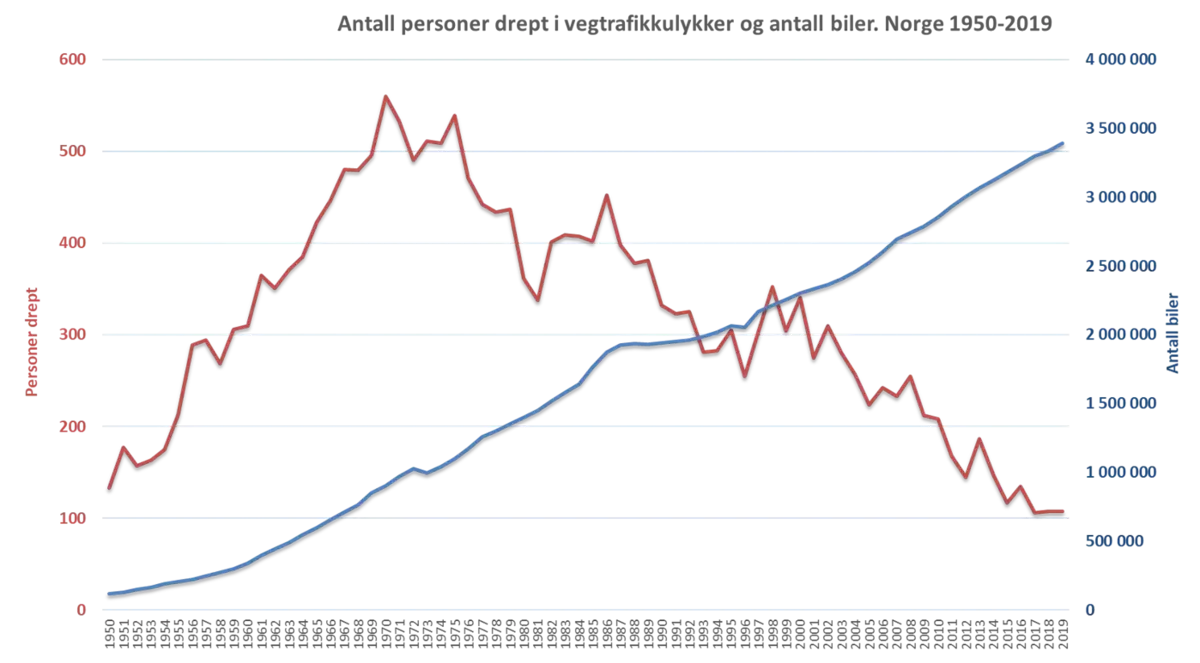 Selv om tendensen er at det er stadig tryggere på veiene og at Norge ligger i verdenstoppen, er dette langt mer enn tall og statistikk. Tar man med at dagens trafikkmengde er 3,4 ganger høyere, skulle over 1.900 ha omkommet i trafikken dersom vi hadde samme risikoen som i 1970..