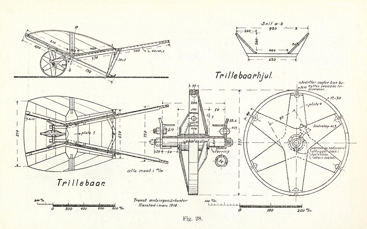 «Trillebaaren er – i den form den benyttes i veivæsenet – et utmerket redskap og saaledes som vor arbeidskraft ligger an, kan den vel neppe for tiden tænkes erstattet eller helt avløst av noget bedre; men trillebaaren har som alle andre redskaper sin begrænsning. Paa større transportlængder blir den uøkonomisk, idet den kræver for stor betjening i forhold til sin transportevne. At arbeideren under transporten maa bære endel av lasten er ogsaa en mangel, som ikke lar sig borteliminere. Trillebaarens væsentligste fordele bestaar i, at den er let at flytte fra anlæg til anlæg, let at læsse og let at tømme, og særlig ved smaa masser og korte transportlængder er dette avgjørende faktorer.»
